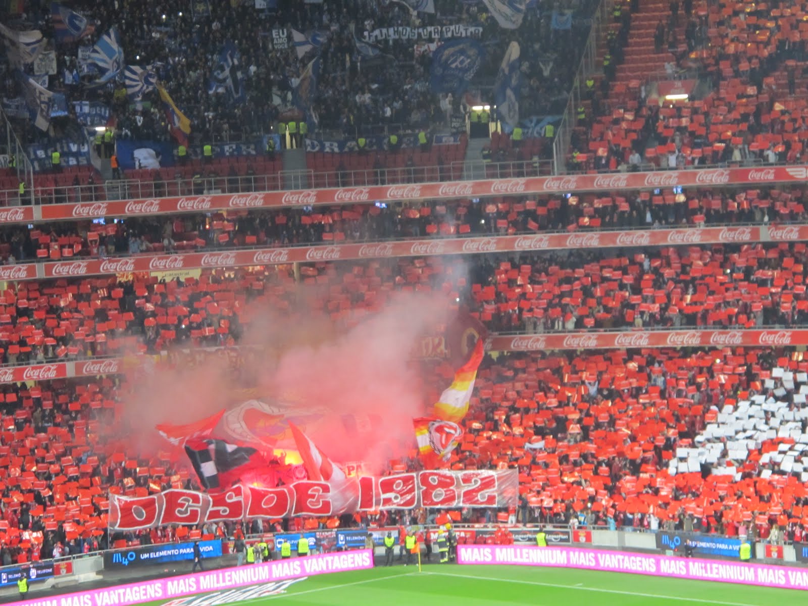 Ao rever as fotos da belíssima coreografia oferecida pelos adeptos do Benfica (ver a este propósito a nossa página "Estádio da Luz") no jogo do passado Domingo, verifiquei que uma delas capturara também parte da falange portista que ocupava a "caixa de segurança" do terceiro anel.